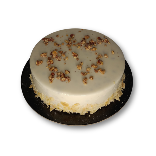 Λευκή μπαβαρουάζ με γεύση πικραμύδαλου, κομματάκια καραμελωμλένου αμύγδαλου και λεπτή στρώση παντεσπάνι. Μια εξαιρετική, ιδιαίτερη τούρτα