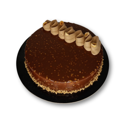 Μους λευκής σοκολάτας με γεύση και κομματάκια φουντουκιών, σε λεπτή στρώση παντεσπάνι και επικάλυψη gianduia με καραμελωμένα φουντούκια