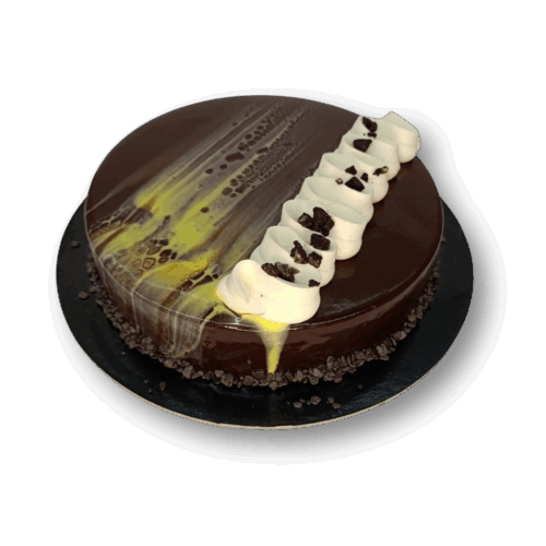 Μους λευκής σοκολάτας με γεύση και κομματάκια μπισκότου, σε λεπτή στρώση παντεσπάνι και επικάλυψη μαύρης σοκολάτας