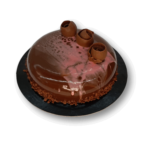 Τούρτα απαλής μους με γεύση φράουλας / σοκολάτας σε λεπτή στρώση παντεσπάνι και επικάλυψη φράουλας